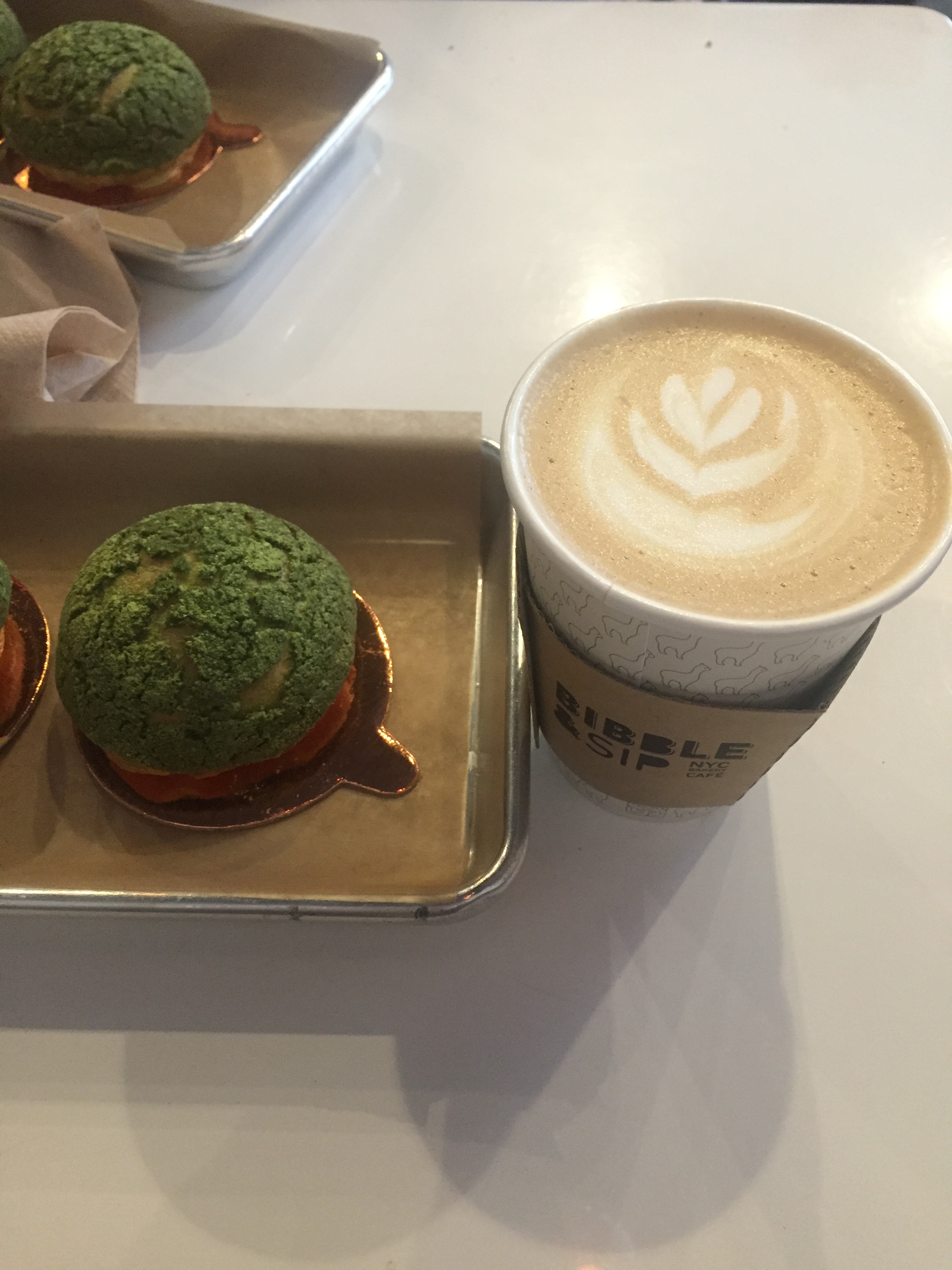 Vi mødtes på “Bibble and Sip” på W 53rd and 8th Ave som er kendt for sine “Green tea matcha cream puff ” boller og lavendel-latte. Vi nøjedes dog med en alm. latte og bollen! Den var virkelig lækker – og folk stod i kø langt ud på gaden, mens vi var så heldige at Jonas havde fået kapret et bord til os!
