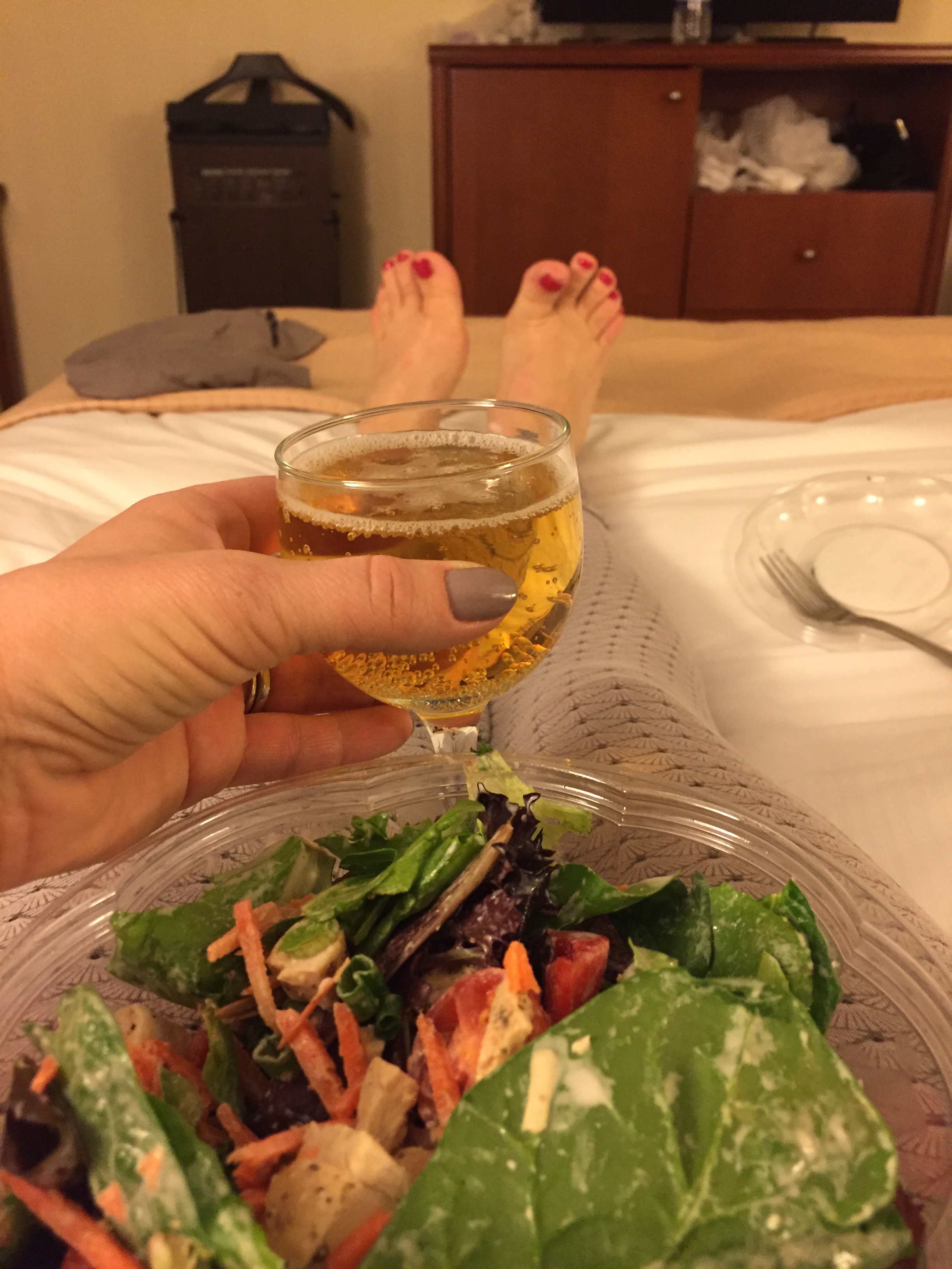 Vel “hjemme” igen gik vi ud og købte et par øl og en lækker salat som vi indtog med benene oppe på vores seng – liiiidt småtrætte var vi da!! 🙂