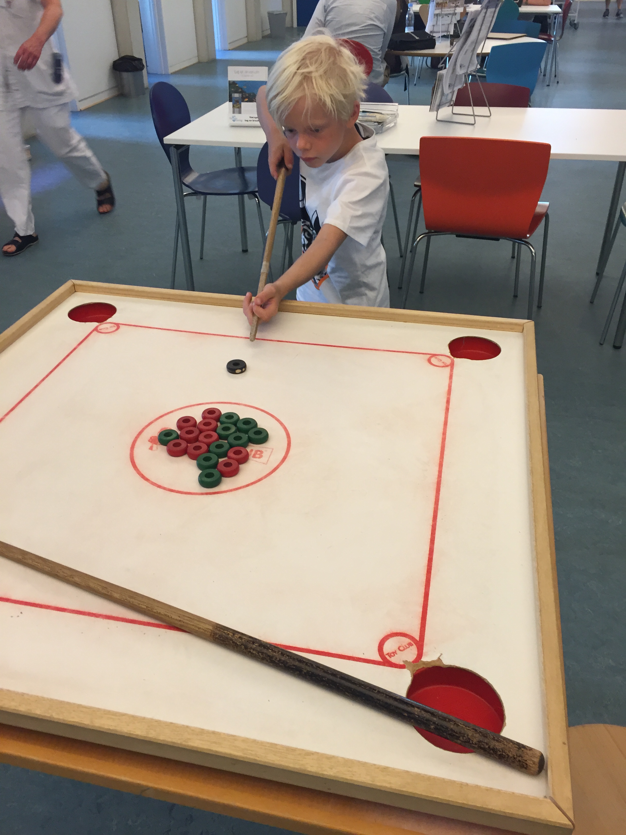Og mens man venter på at komme ind, kan man spille bordfodbold og bob – og han bliver vildt sur hvis han taber! 😉