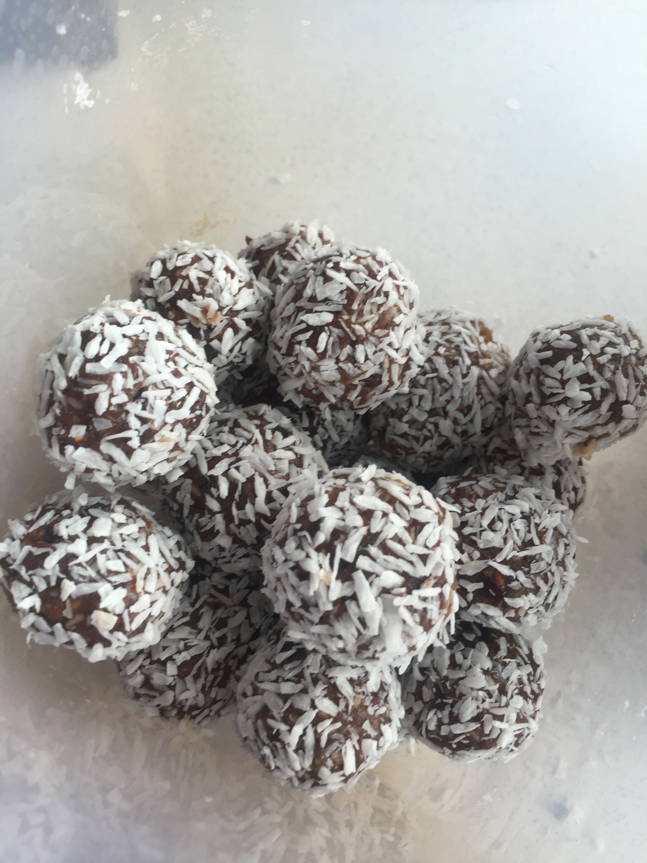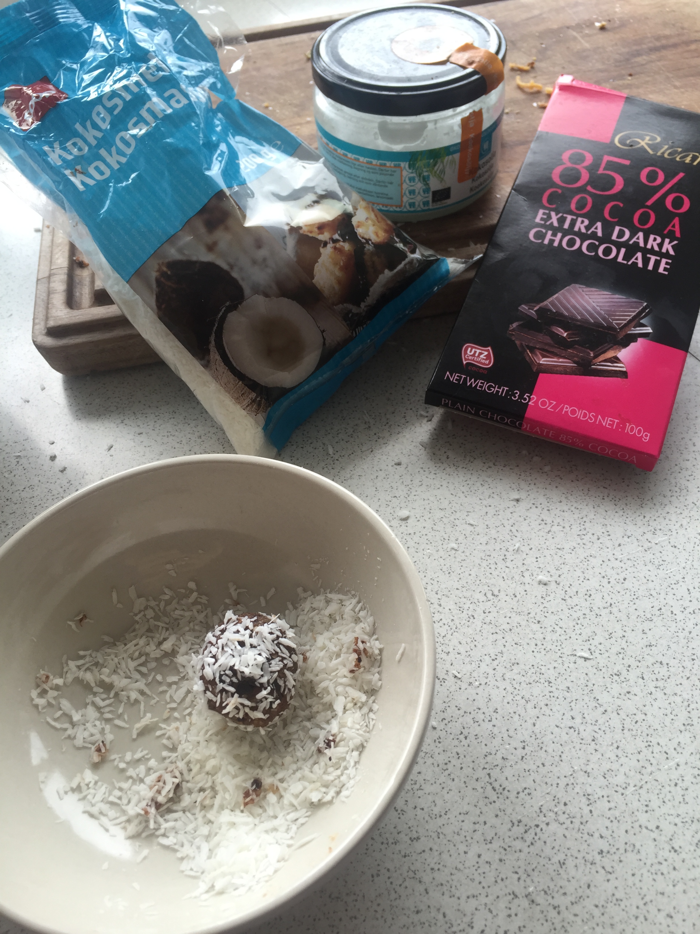 I dag derimod laver jeg dadelkugler! Det er nemlig langt sundere med sådan nogle end fx. havregrynskugler med masser af sukker i, eller en ditto chokoladekage! Mand og børn vrænger på næsen og tør næsten ikke smage – men jeg presser dem og hov! De kunne vist lige gå an! 🙂