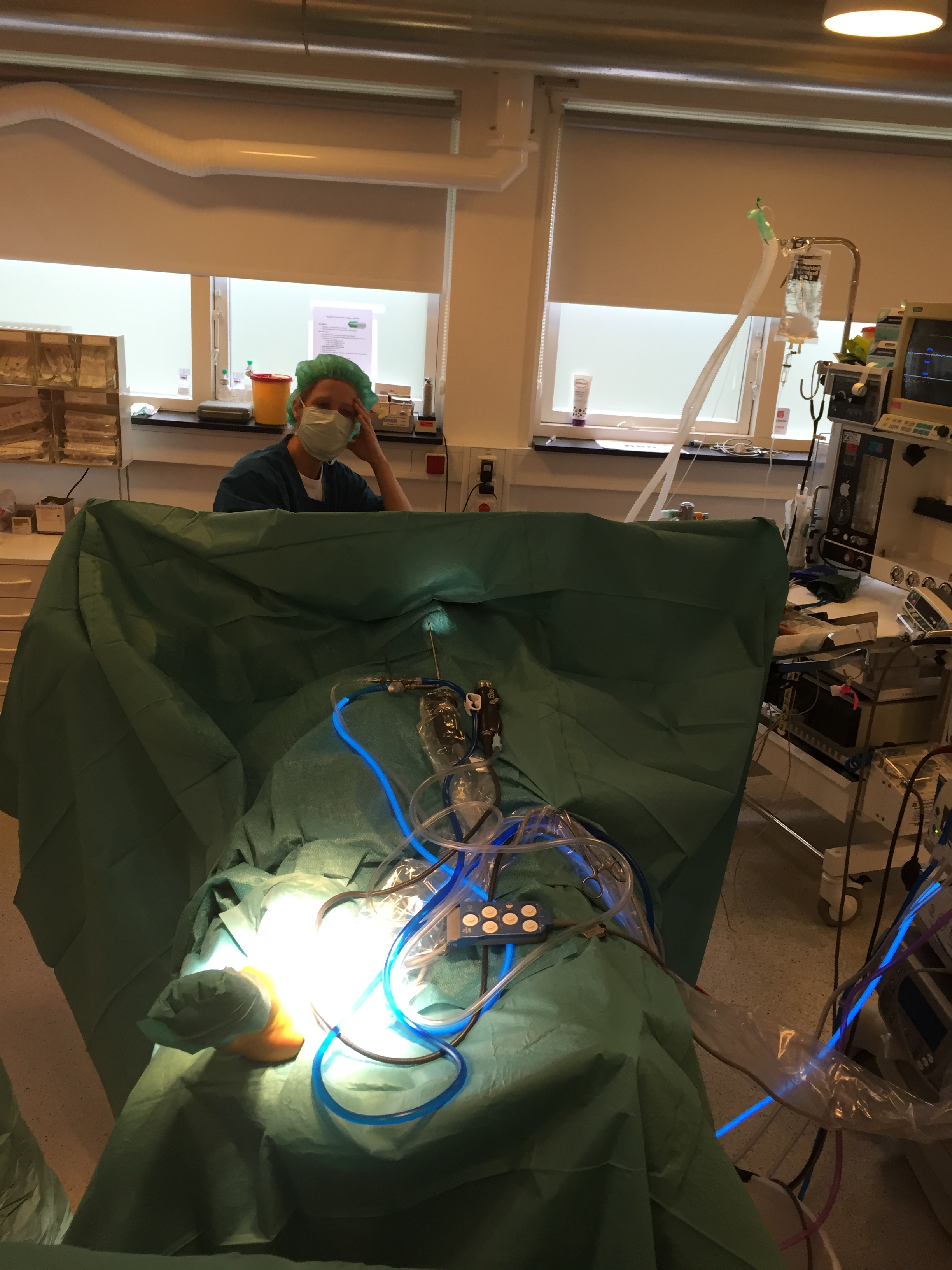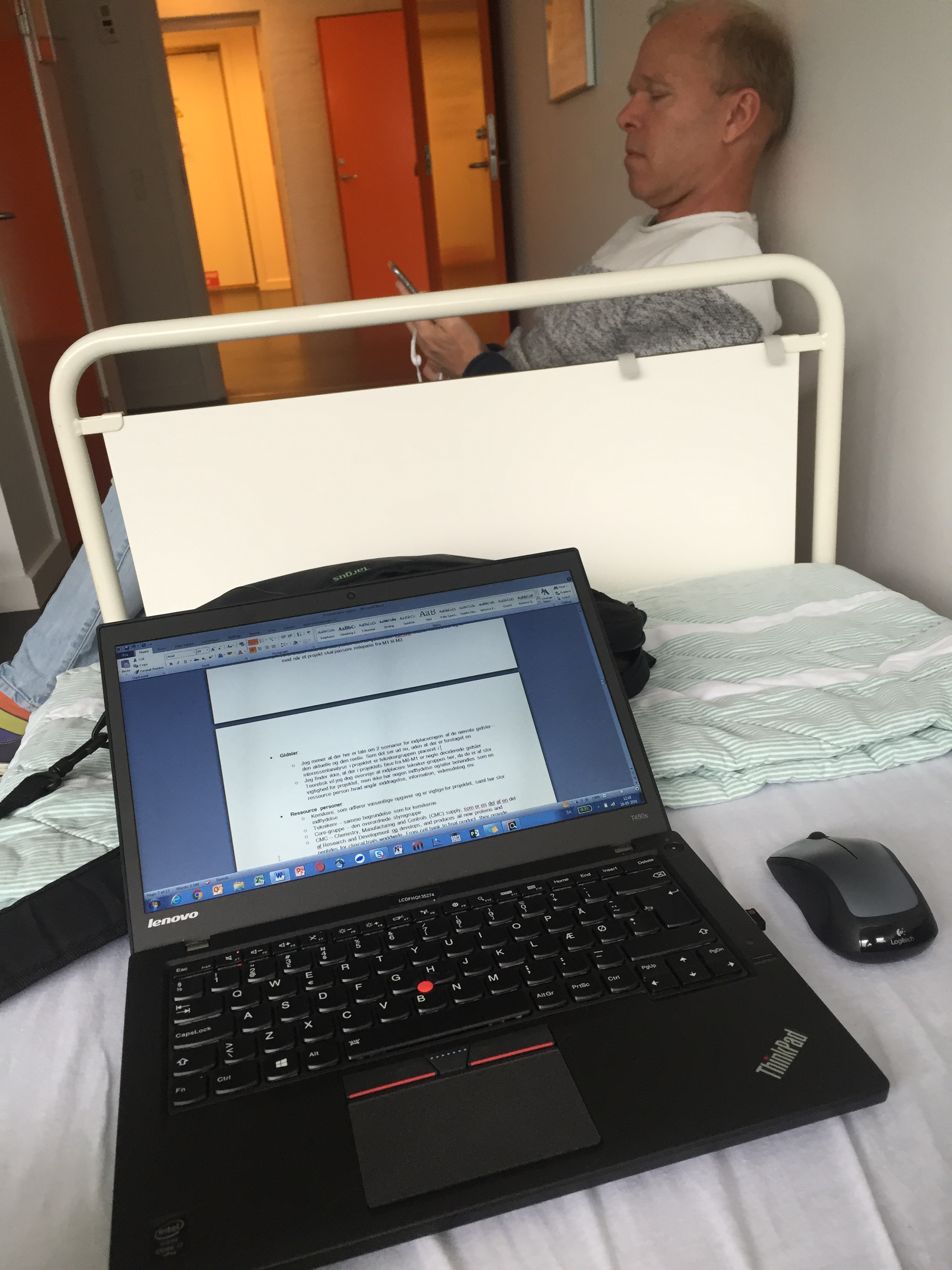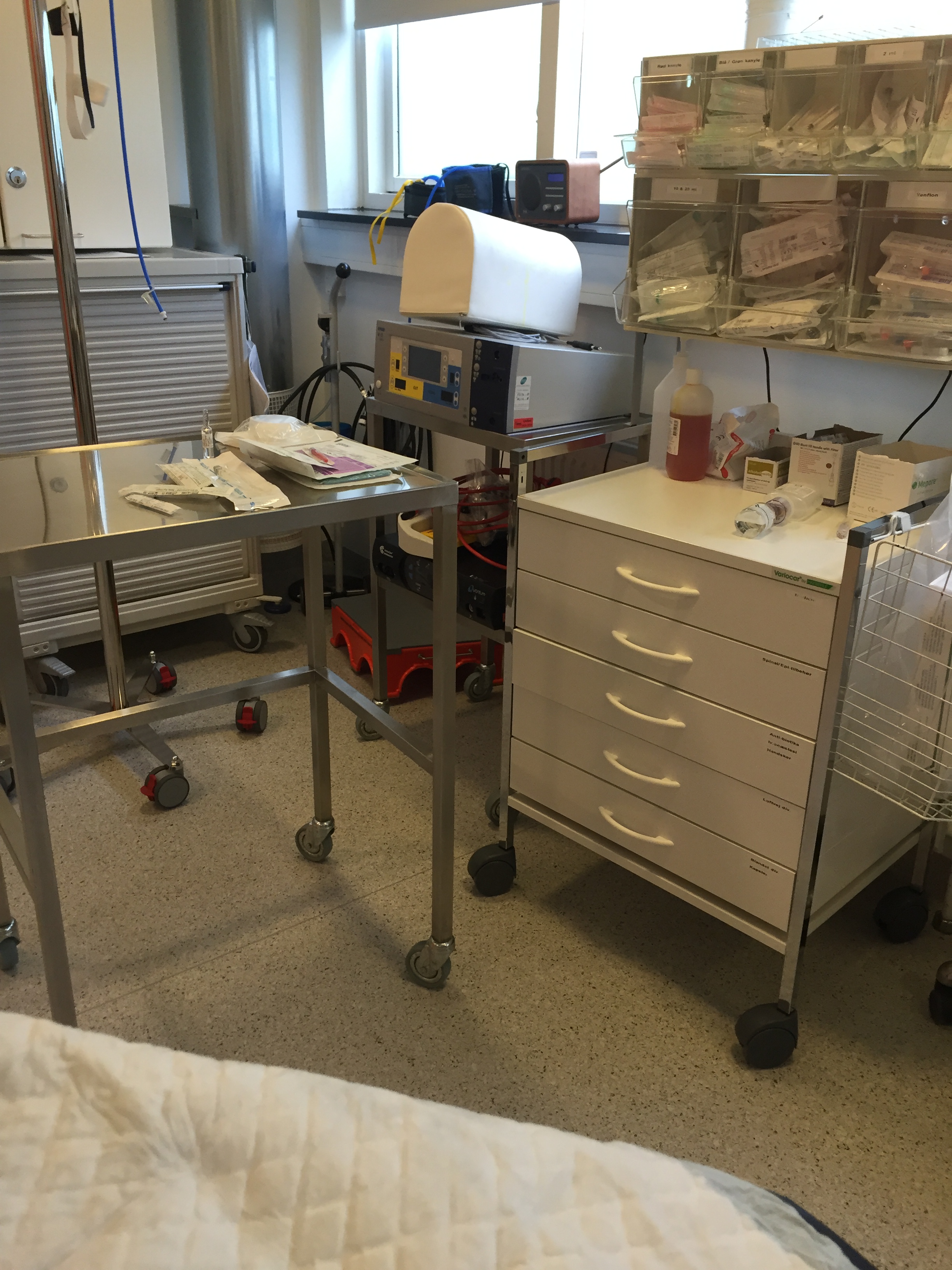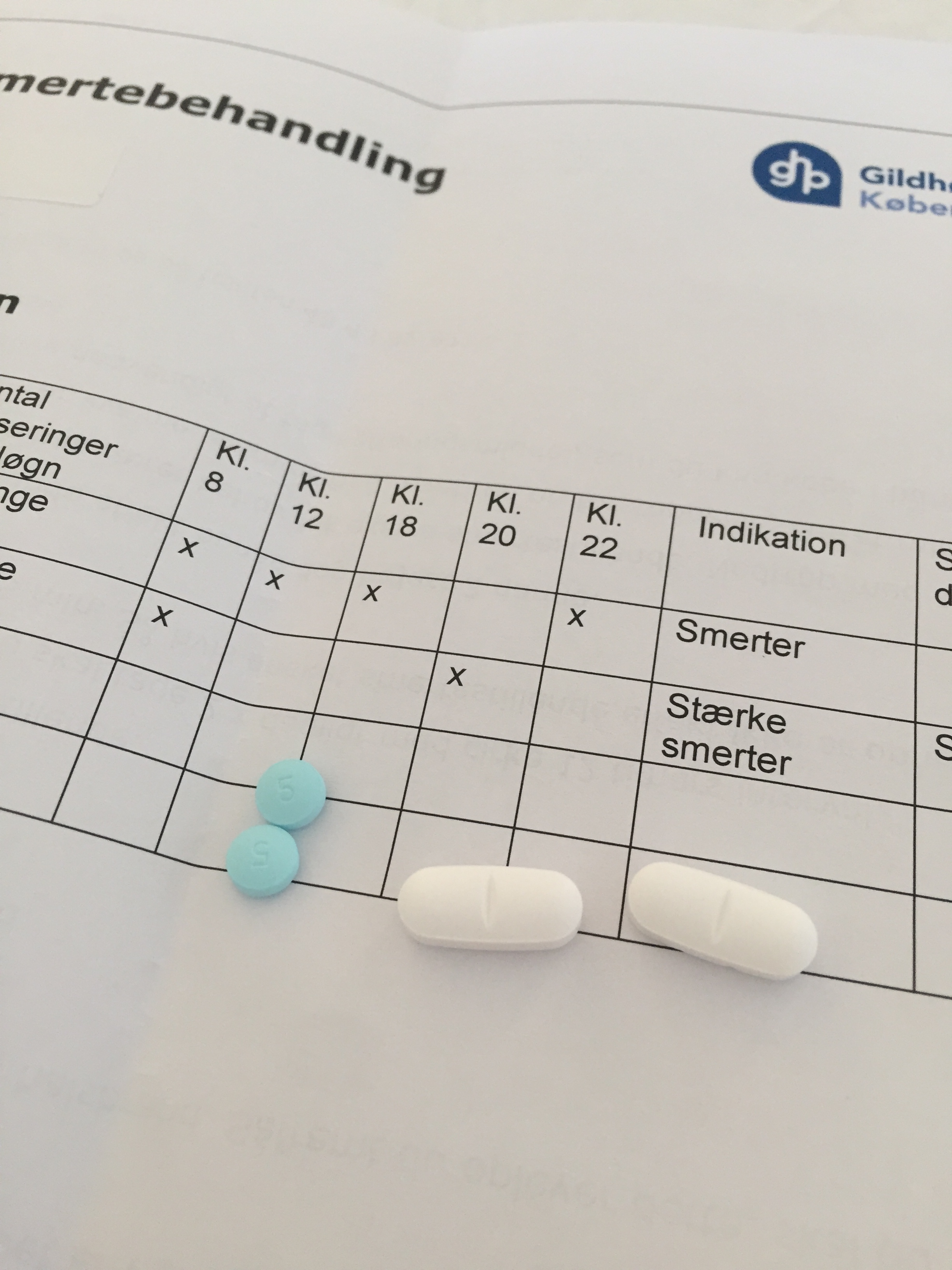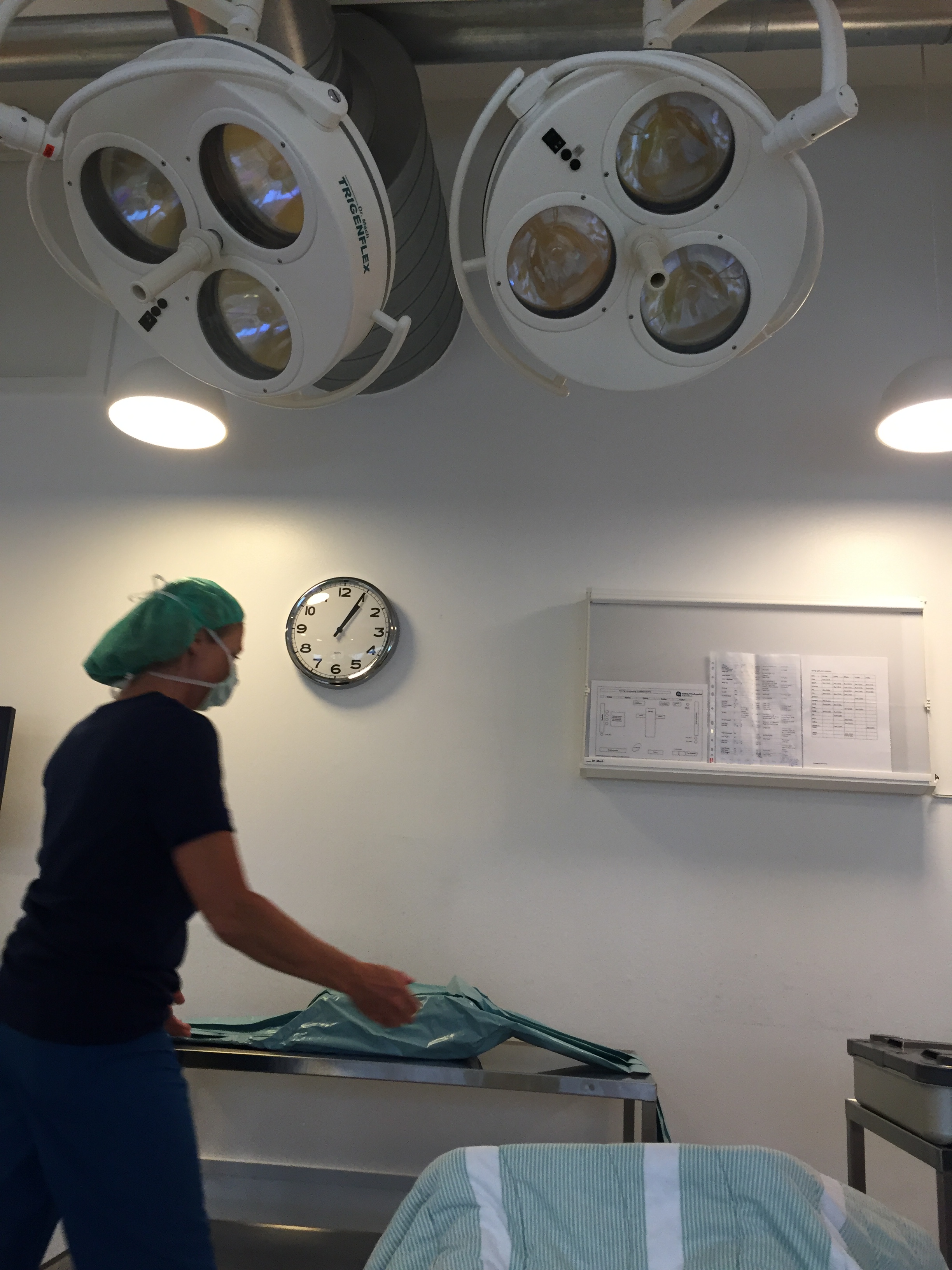 Da vi ankom fik jeg anvist en seng, talte lidt med en sygeplejerske og fik de første piller; lidt morfin, pamol og en kvalmenedsættende. Og så skulle vi bare vente på anæstesien og lægen. Jeg kunne vælge mellem en fuld narkose eller en rygbedøvelse og valgte det sidste – erfaring fra en blindtarmsoperation som 16-årig med bivirkninger efterfølgende gjorde valget let – OG så kunne jeg jo følge med under selve operationen!