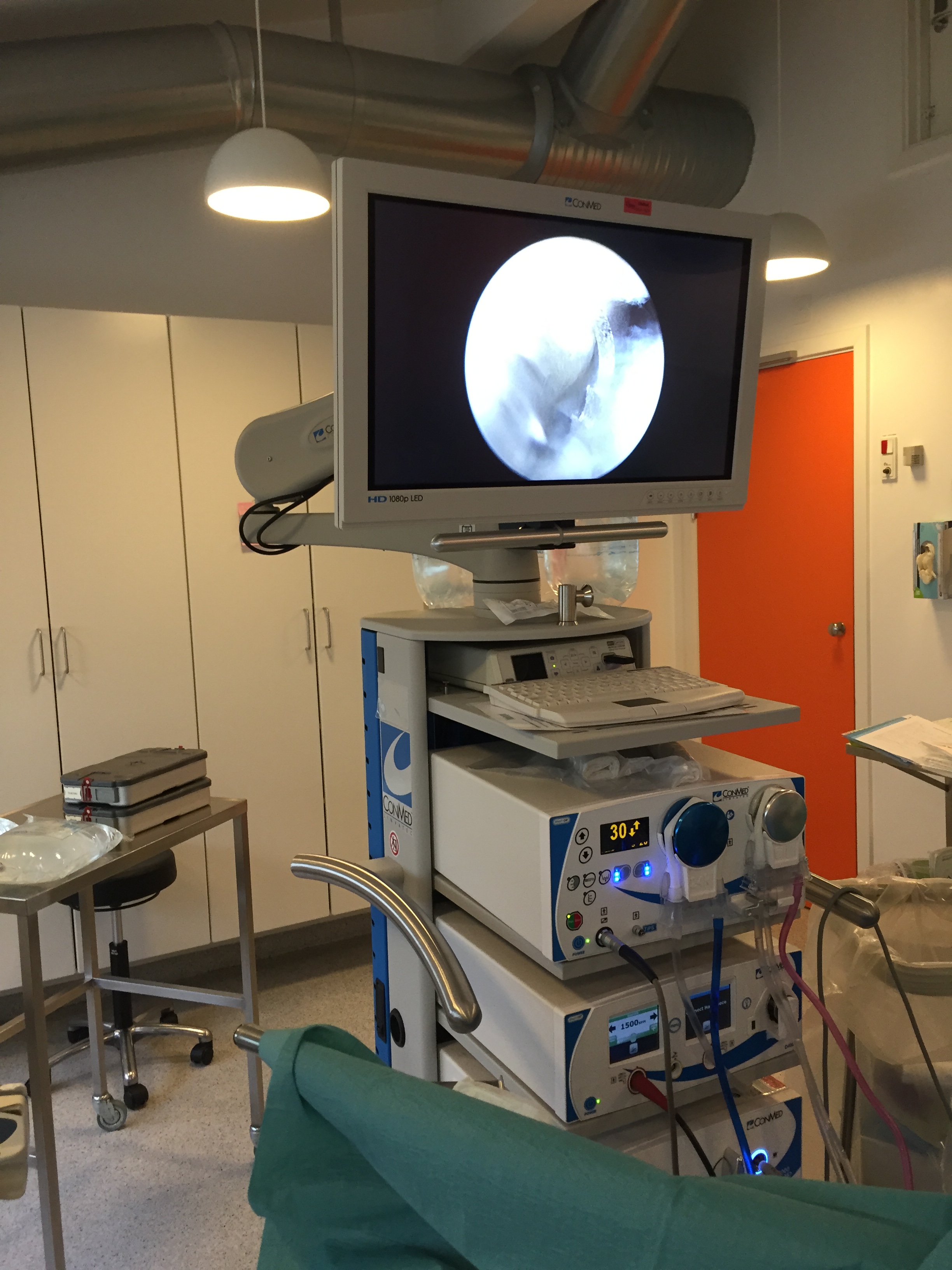 Det viste sig hurtigt at leddet var fyldt med kronisk inflammatorisk væv og han brugte sådan en smart “shaver” til st støvsuge og skære vævet væk. Jeg kunne også tydeligt se flere revner i min brusk – meget fascinerende!