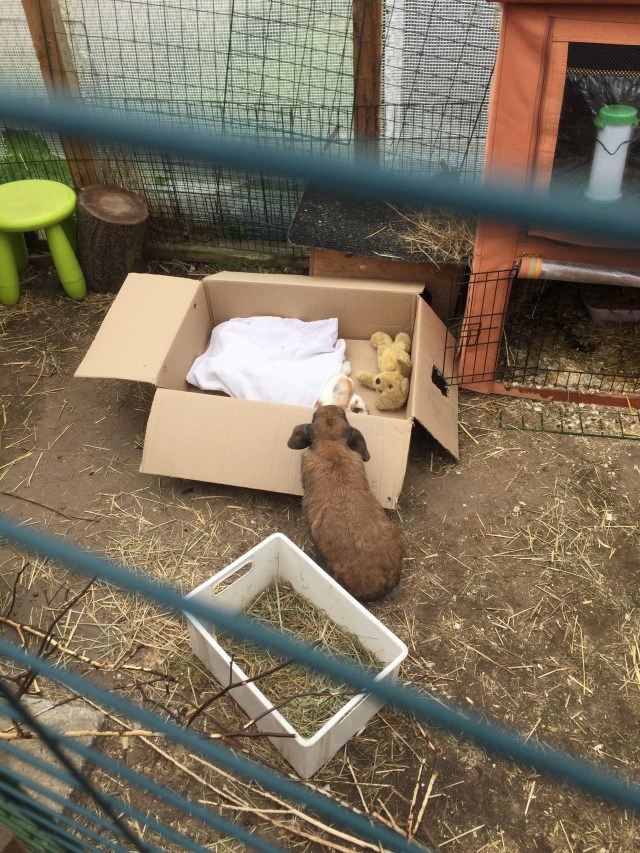 Pigerne og jeg tog ind på dyrehospitalet og hentede ham (og nåja betalte kr. 2500!! som behandlingen, røntgen mv. kostede). Han lå i et håndklæde og så fin ud. Herhjemme satte vi kassen med ham ud til de 2 andre kaniner, så de kunne se og forstå at han ikke var der mere, og ikke ville komme tilbage.