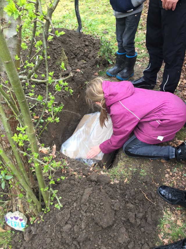 Celina var mega sej – hun var med til at grave, puttede selv kassen i jorden og kastede jord på. Bagefter pyntede hun graven med stenen og blomster.