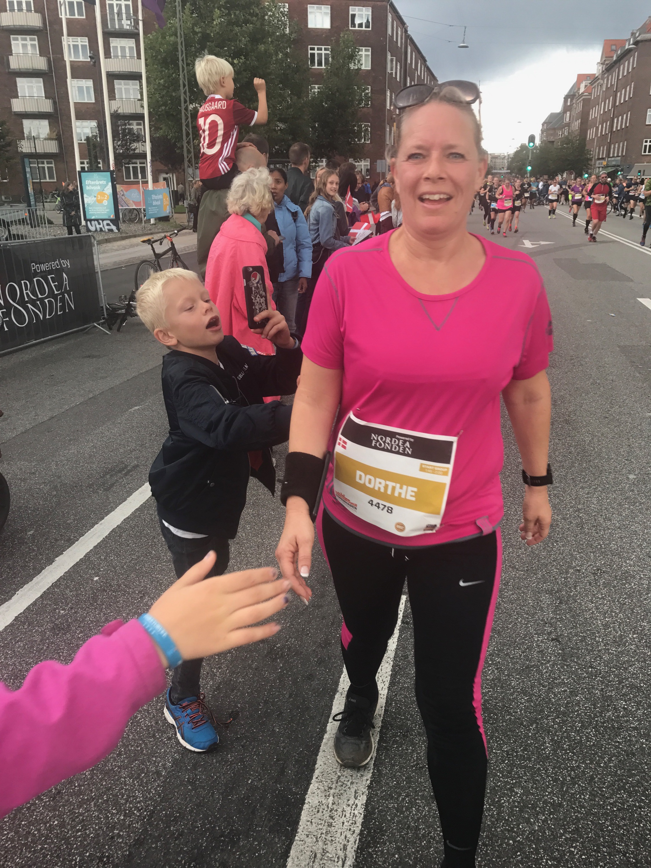 Vejen gik gennem Frederiksberg – totalt mit barndoms-hood, ned af Godthåbsvej, Falkoner Allé og Frederiksberg Allé – det var som at være hjemme! Meeen jeg var også begyndt at blive liiiidt træt. Ungerne ventede ved Ingerslevsgade lige efter 11 km, og jeg stoppede gerne op for lige at sige hej, men Basse mente bare jeg skulle skynde mig videre.