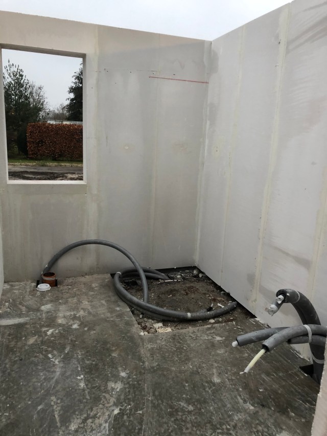 “Hullet” med slangerne er vores kommende bruseniche. Til venstre op mod væggen skal der være et badekar – vi glæder os alle til dette! 🙂