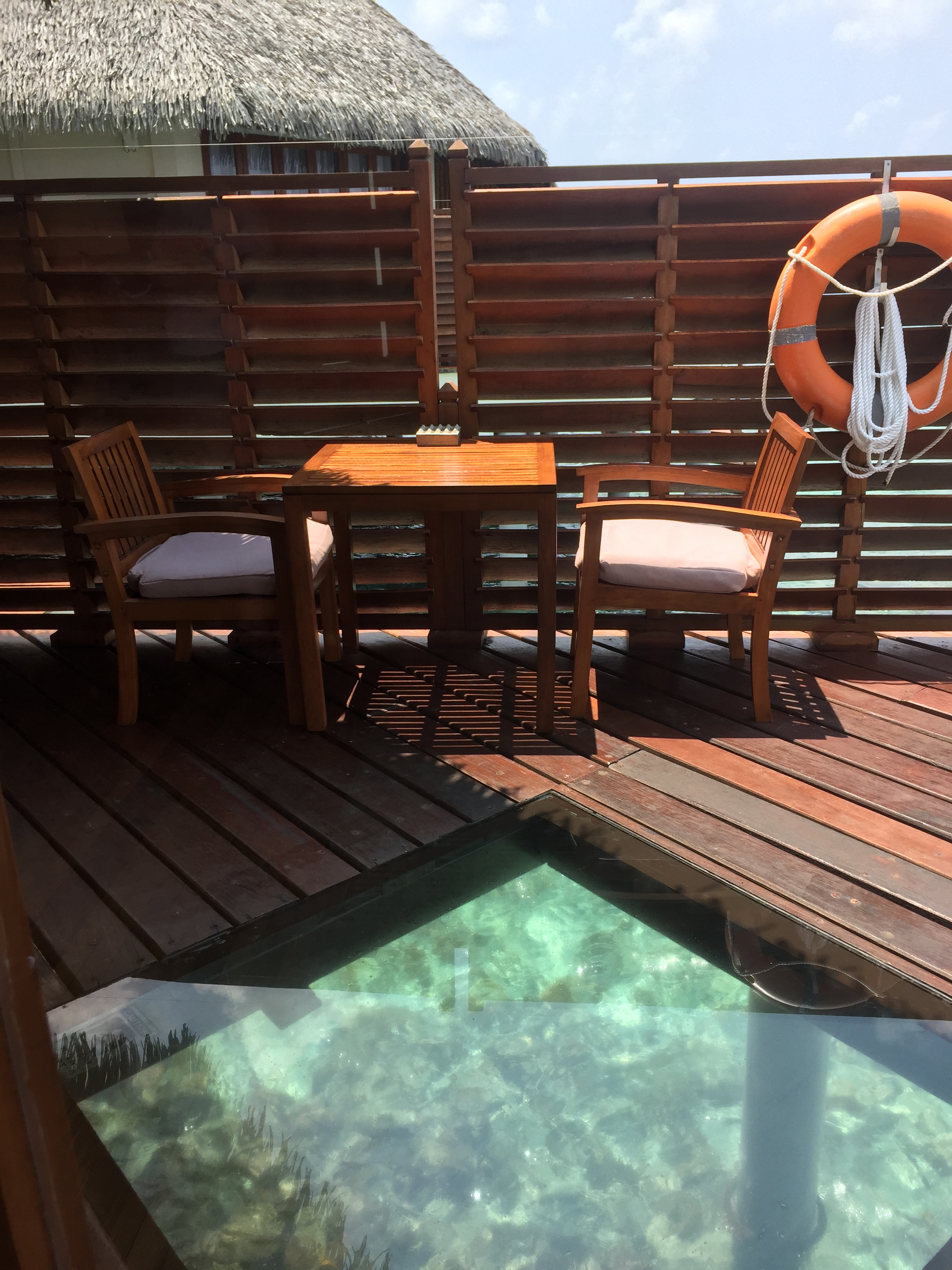 Spisearrangement på terrassen, bemærk glasgulvet med kig til vand og fisk nedenunder