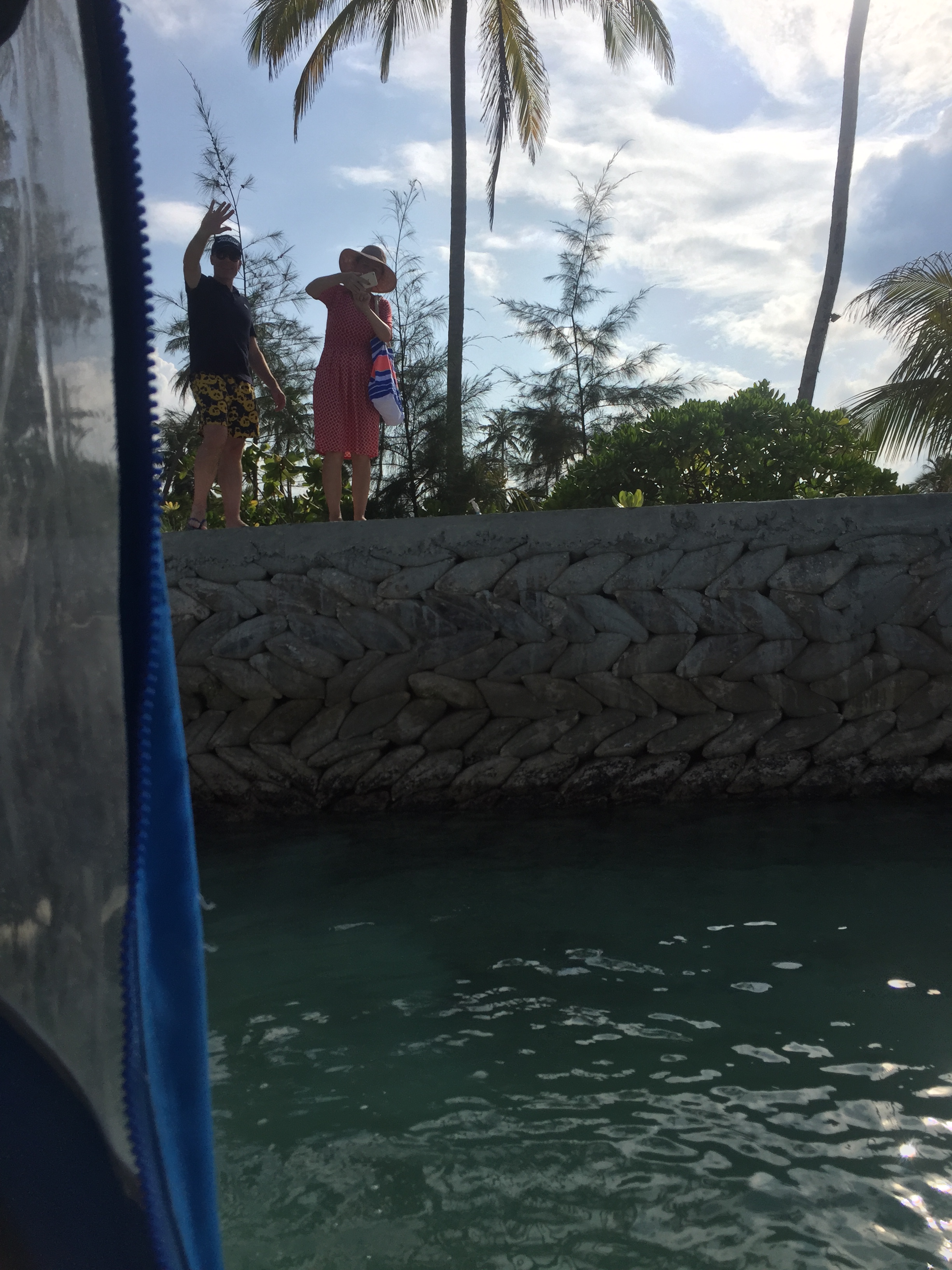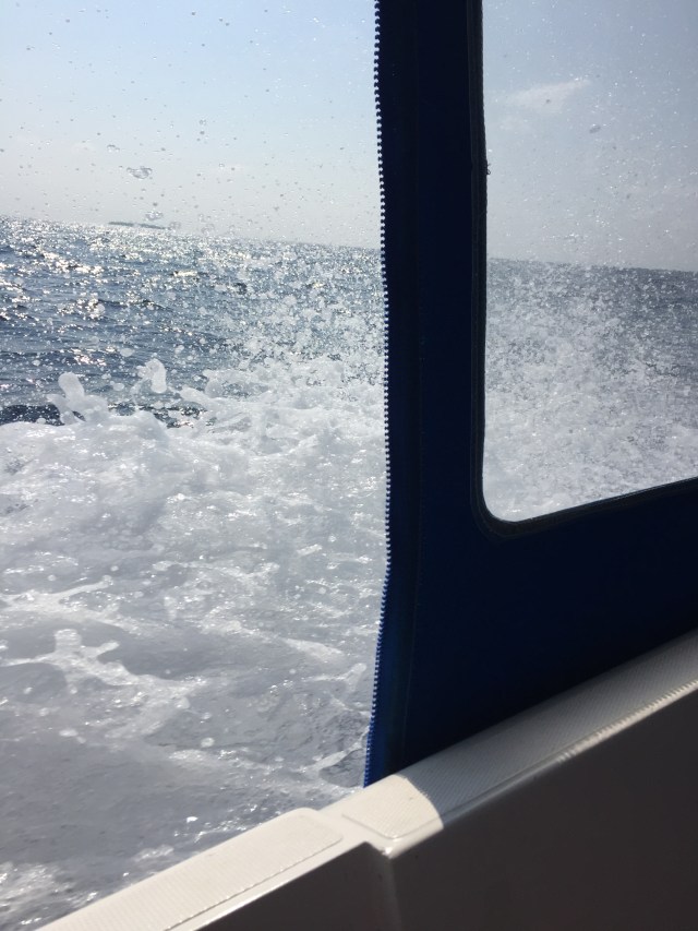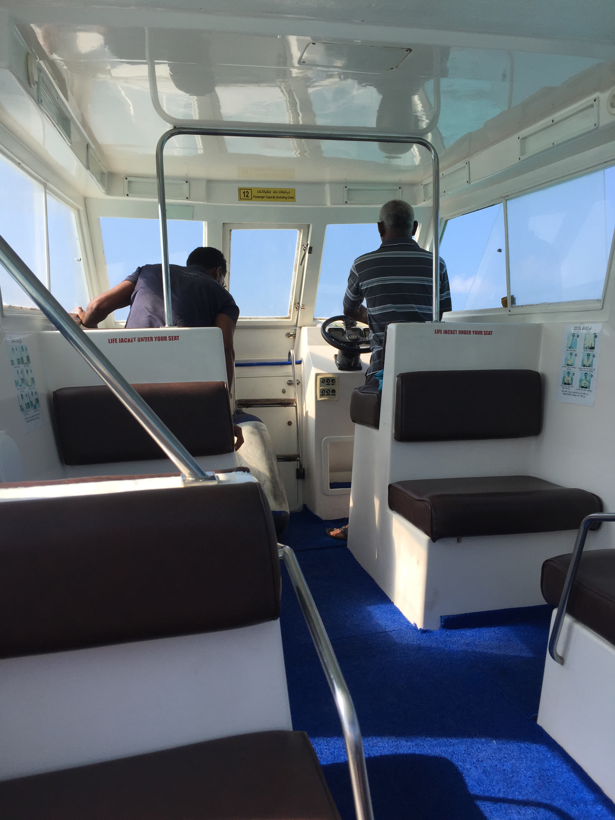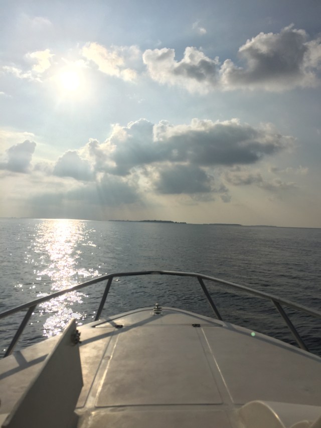 Men Adam, vores butler, entrerede en speedbåd for os, som blev ført af farmand mens sønnike agerede matros – eller noget! Og sønnike formåede endda at tage en lille blunder på turen selvom der var pænt med bølger og deraf hårde dyk ind imellem! Vejret var smukt nok, men da vi var ude i ingenting og mellem de 2 atoller, skulle man ikke spekulere mere over HVOR langt der var til land hvis der skete noget!