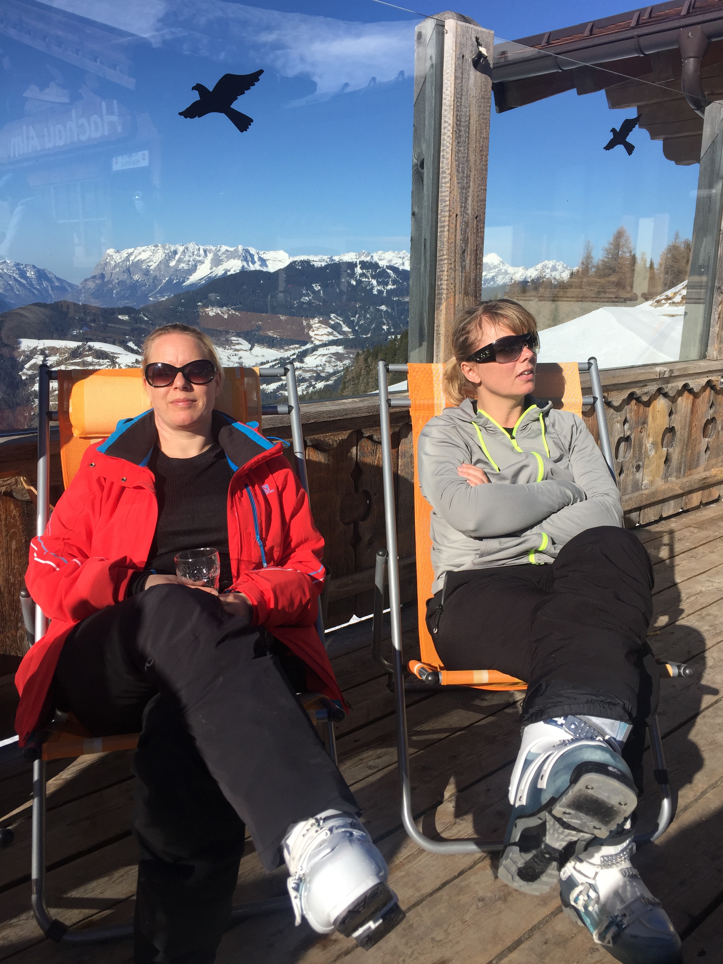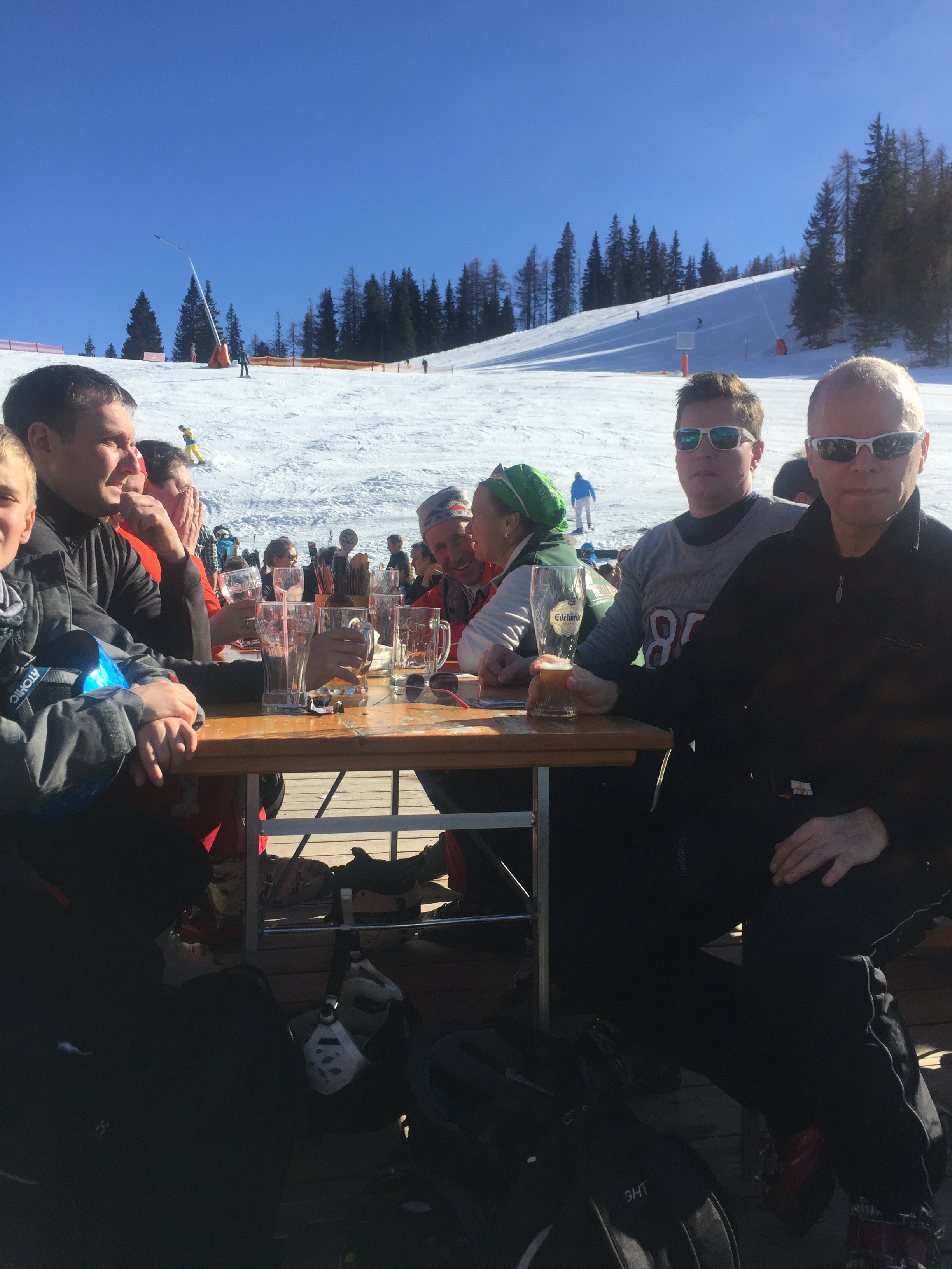 Det måtte udnyttes, så vi holdt afterski på udsigtsstedet lige ved Kogelalm. Det var SÅ skønt, og som de andre også kom hjemad, samledes hele flokken til en drink/sodavand indtil solen gik ned!